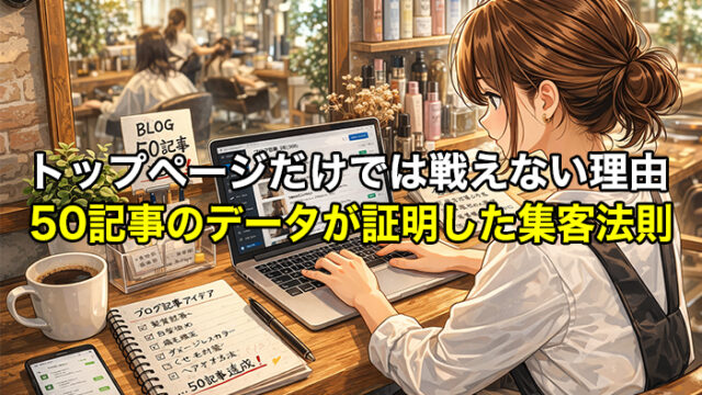 実践LOG トップページだけでは戦えない理由 50記事のデータが証明した集客法則 2026年4月19日 neozeon0079@ms-375.com ホームページ制作のモニターを行っている美容室から、継続的に集客の報告をいただいています。 ホームページ制作から約1年が経過し、ブログ記 …