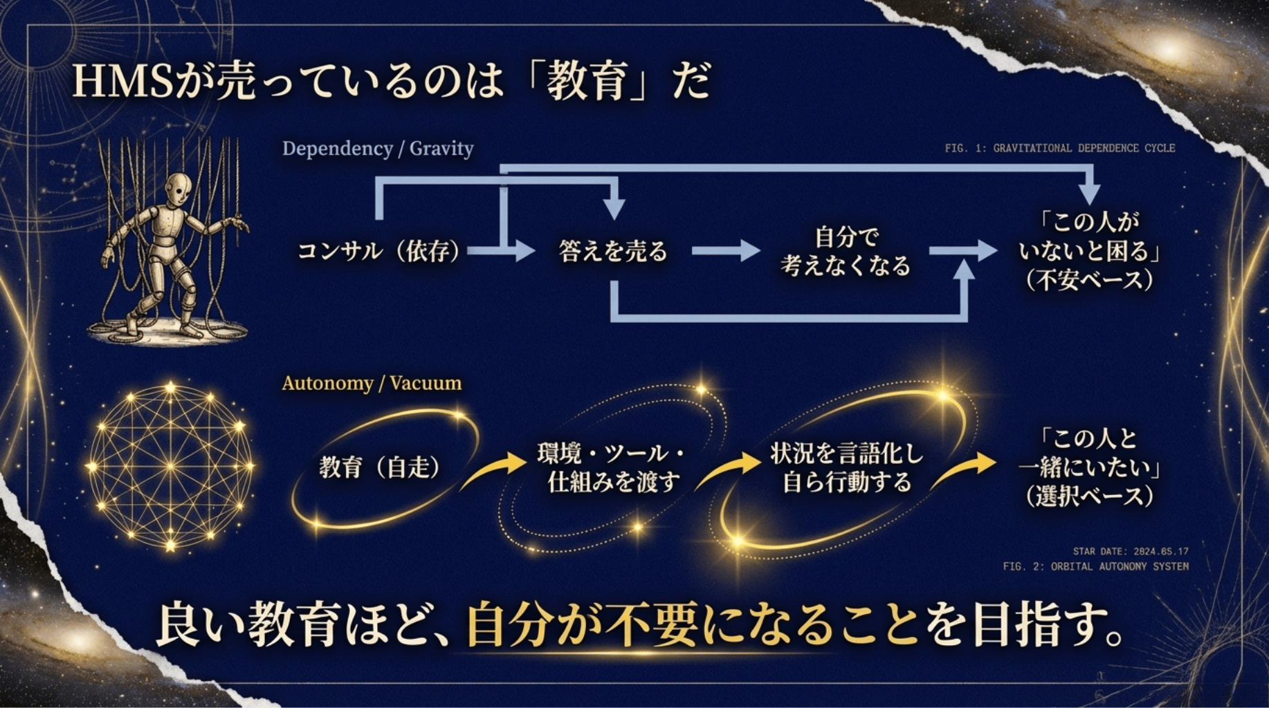 良い教育ほど、自分が不要になることを目指す。自走できるクライアントほど、逆に信頼が深くなる。依存している間は「この人がいないと困る」という不安ベースの関係だ。自走できた時に初めて「この人と一緒にいたい」という選択ベースの関係になる。