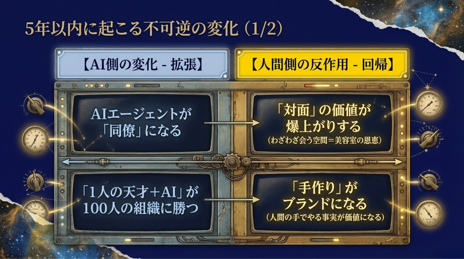 AI側の変化と、人間側の反作用を交互に並べた。この「反作用」が見えていない人が多い。