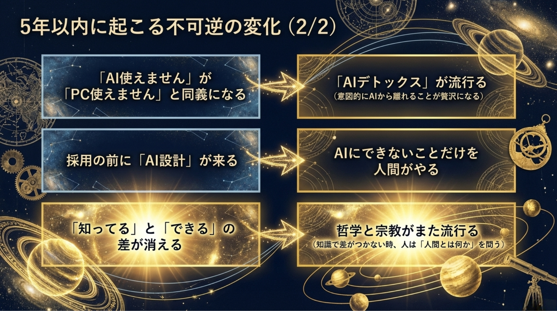 AIが仕事を奪い、知識で差がつかなくなった時、人は「人間とは何か」を問い始める。産業革命の時もそうだった。AIはその比じゃない衝撃を社会に与える。
