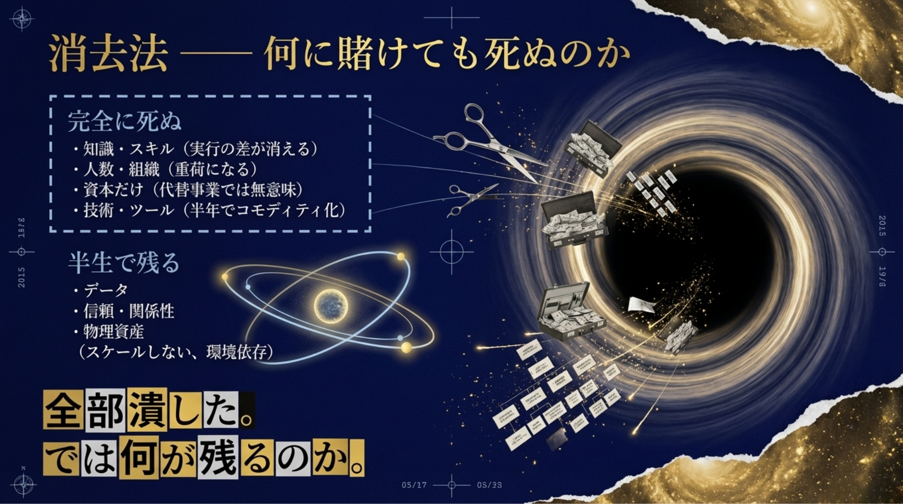 では何に賭ければ生き残れるのか。賭けられる資源を全部並べて消去法でいく。