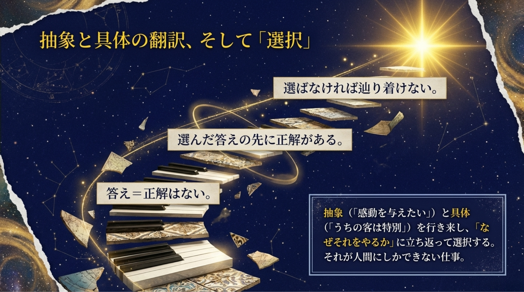抽象と具体を行き来できない人は、この「選ぶ」ができない。具体しか見えない人は「うちのお客さんは特別」で止まる。抽象しか語れない人は「感動を与えたい」で止まる。どちらも行動に落ちない。